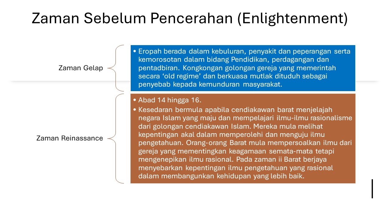 a) Sejarah Pemikiran Eropah, daripada zaman sebelum, semasa dan selepas Enlightenment