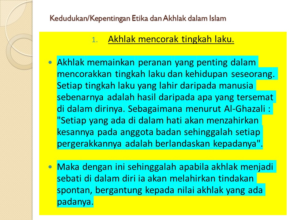 Sumber etika dalam Islam adalah dari Al-Quran dan Hadis Nabi Muhammad SAW.