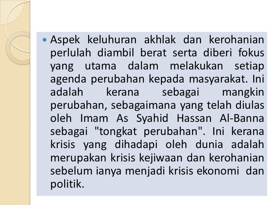 - Penghayatan etika dan peradaban mengikut peringkat individu, keluarga, komuniti dan masyarakat (tempatan dan global)