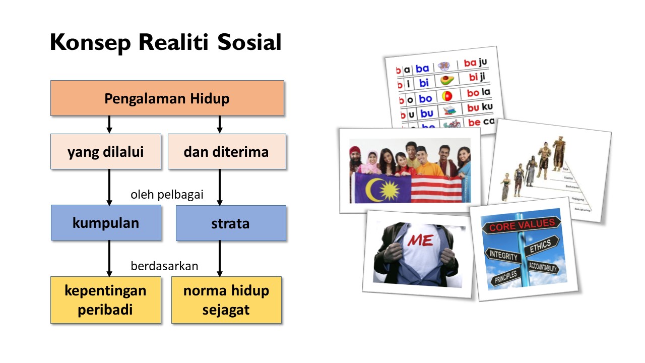 Konsep realiti sosial menggambarkan pengalaman hidup yang dilalui dan diterima oleh pelbagai kumpulan dan strata berdasarkan kepentingan peribadi dan norma hidup sejagat. Sebagai contoh, dahulu ketika kita mula belajar mengeja dan membaca, kita belajar daripada ibu bapa di rumah. Apabila masuk ke sekolah, ia juga merupakan proses pembelajaran formal. Pengalaman yang dilalui itu boleh dinikmati oleh semua tanpa mengira kumpulan etnik dan strata, iaitu sama ada seseorang itu kaya, miskin, bangsawan atau rakyat jelata. Ia juga bertujuan memperoleh ilmu pengetahuan dan dapat menggunakan ilmu tersebut untuk manfaat masyarakat seluruhnya.