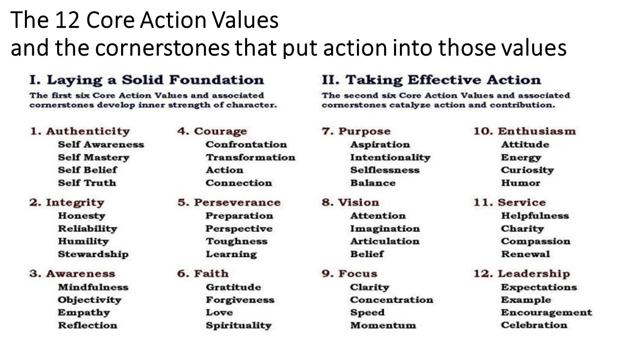 Enam nilai tindakan teras kedua yang berkaitan menjadi pemangkin tindakan individu, iaitu: Tujuan, Penglihatan, Fokus, Semangat, Perkhidmatan dan Kepimpinan.