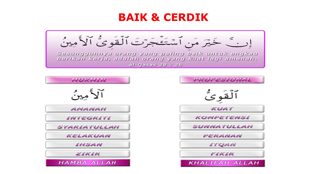 Intipati kepada kesemua teras itu berpaksikan firman Allah SWT dalam surah al-Qasas 28:26 berkaitan orang yang paling baik untuk diberikan kerja, dengan memiliki sifat ‘qawiyy’ dan amin. “Qawiyy’ merujuk kepada profesional, kuat, kompetensi, sunnatullah, kelakuan, ihsan, itqan dan fikir yang merupakan nilai kepada khalifah tuhan.